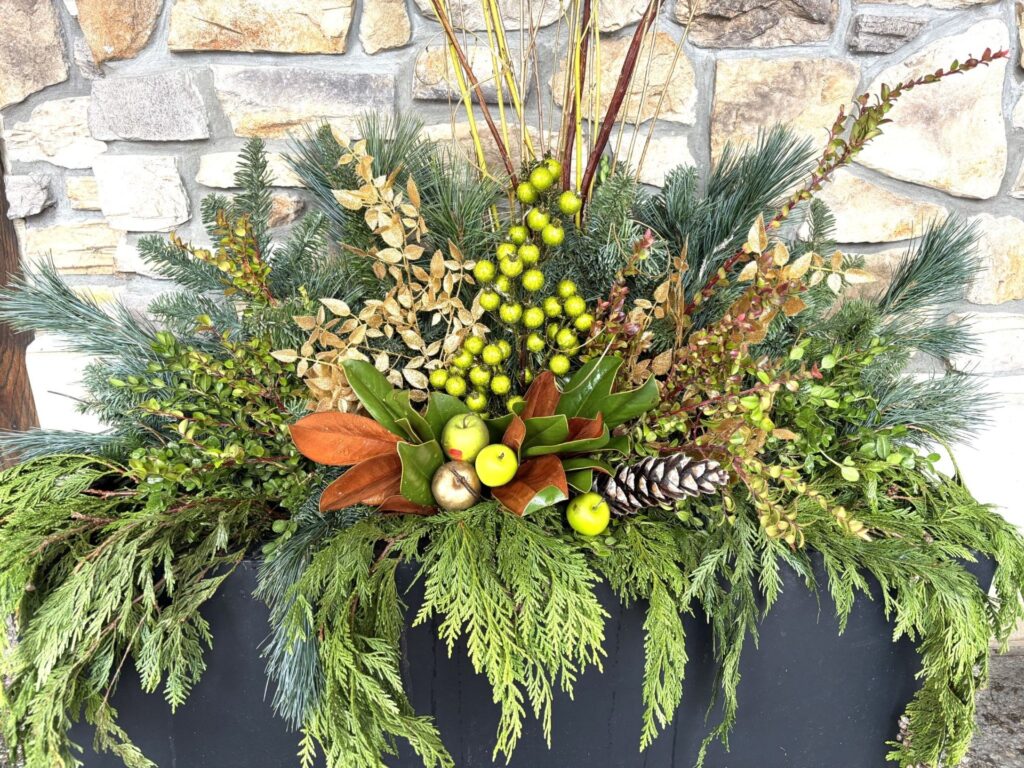 In contrast with the vibrant reds, yellows, oranges and purples of summer planters, wintertime pots tend to feature the more earthy shades of greens, browns and creams. To bring pops of natural color to arrangements, add branches of red or yellow twigged dogwood, scarlet or golden willow, red huckleberry, variegated boxwood or white edged holly. For the holiday season, it’s easy to expand the color palette by using spray painted branches or purchased decorations as focal points.