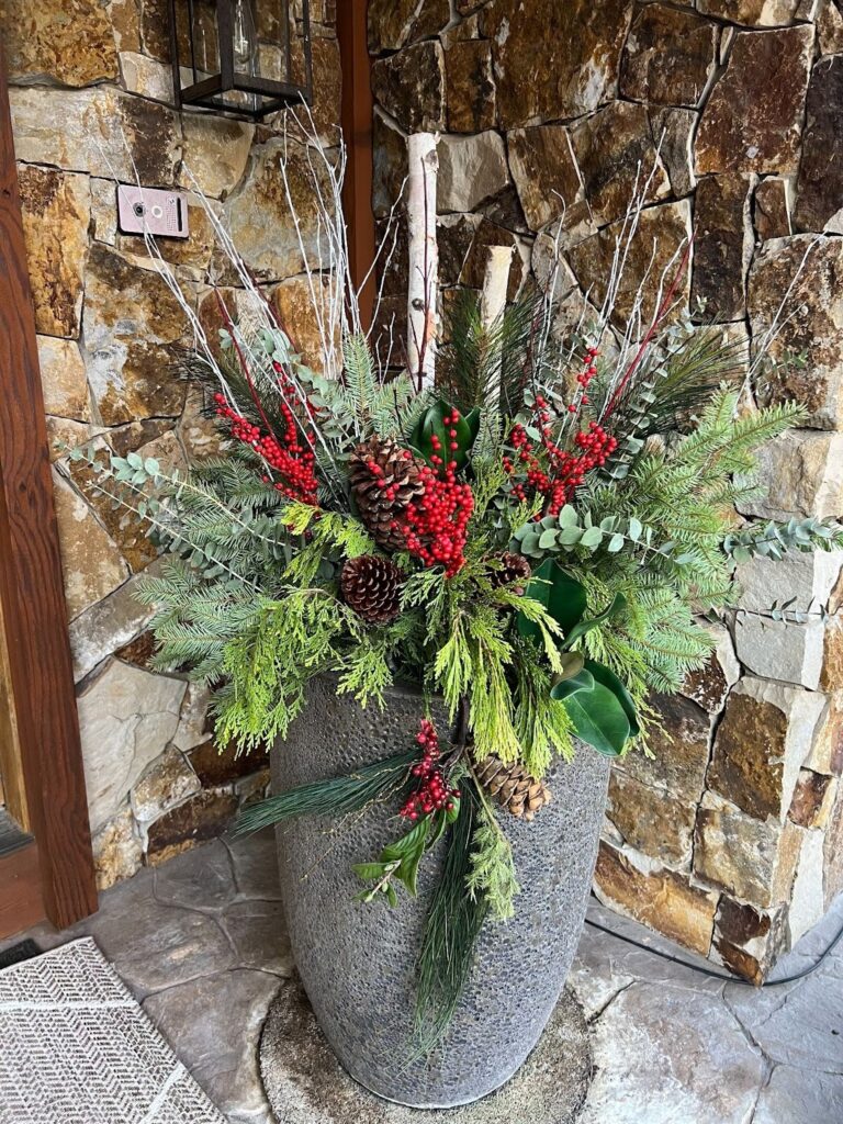Winter containers that combine living and natural materials (branches, seed pods, berries) with holiday flourishes (balls, bows, ribbons) not only celebrate the joy of the season, but also answer our ongoing need to connect with nature even in the middle of the winter.