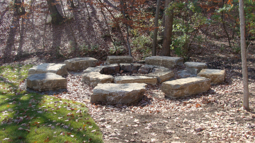 Now that they are older and their sandbox days are over, I think that it’s time to transform the space and make some new memories. Since the spot has gorgeous fall and winter views – it faces the craggy stone cliff of the quarry below – and is sheltered from chilly winds by a grove of trees, it would make a lovely seating area. I’m envisioning exchanging the play equipment for a paver patio with a stone fire pit surrounded by comfortable chairs and cozy blankets to ward off the chill of the coming fall evenings. I think that there would even be enough room for a small cabinet that could hold all the supplies you need for roasting marshmallows or making s’mores accompanied by mugs of steaming hot chocolate.