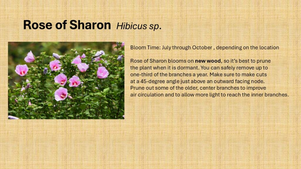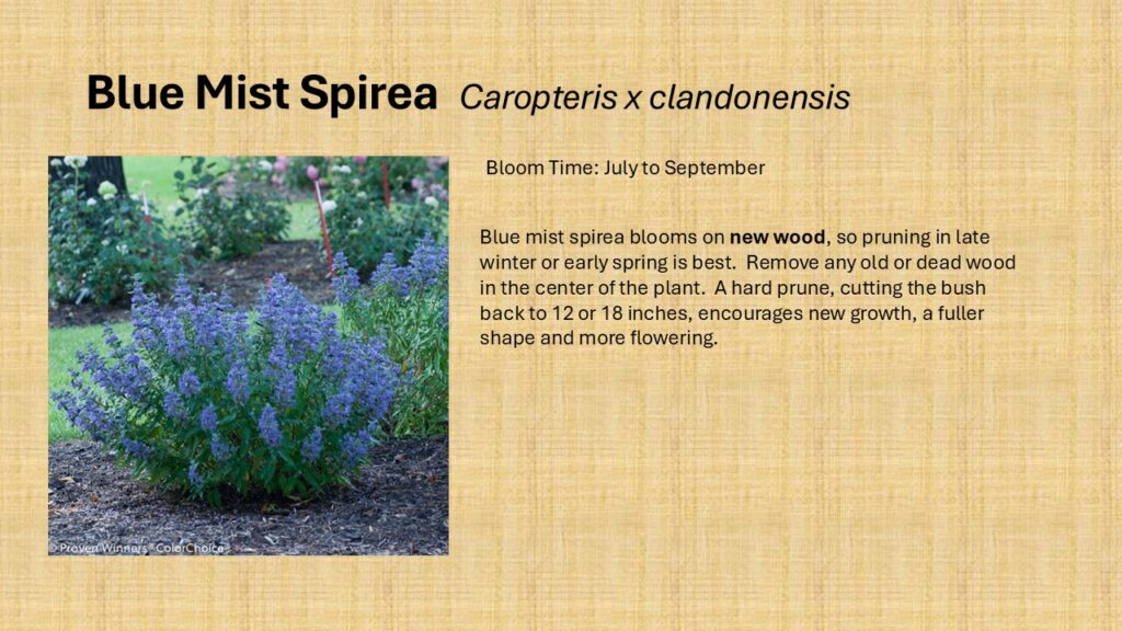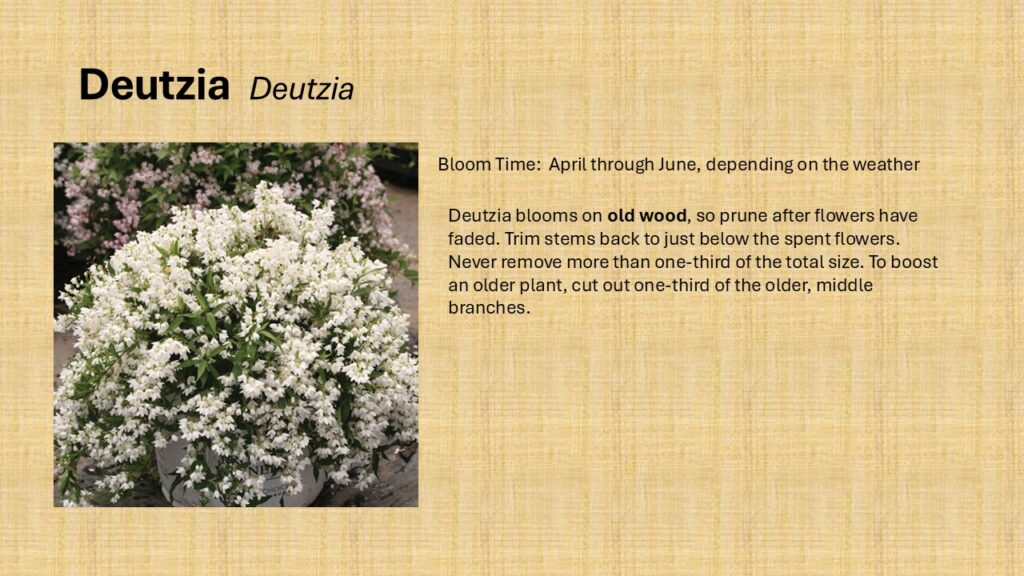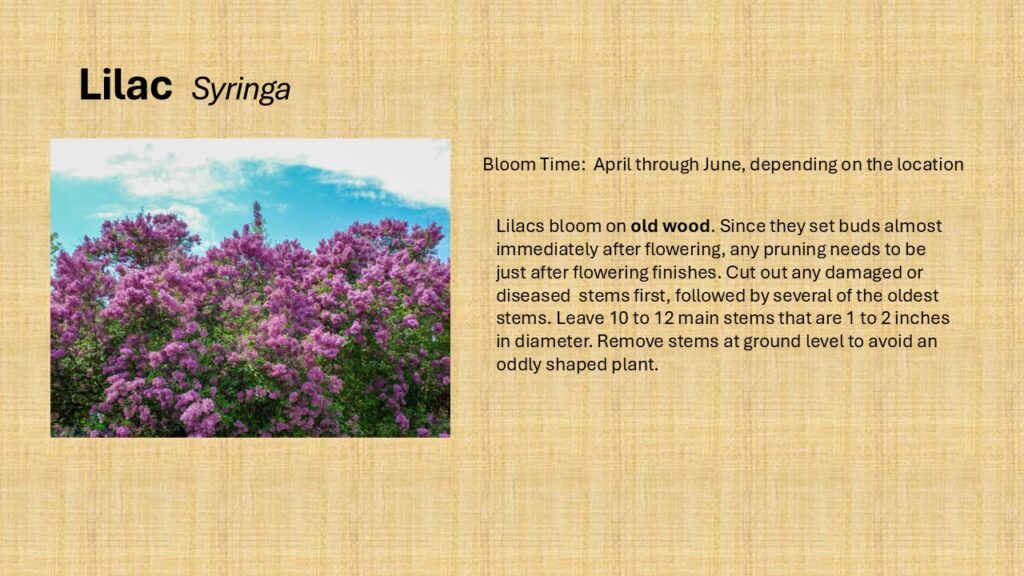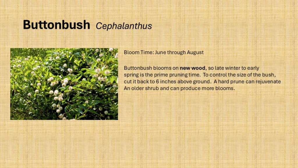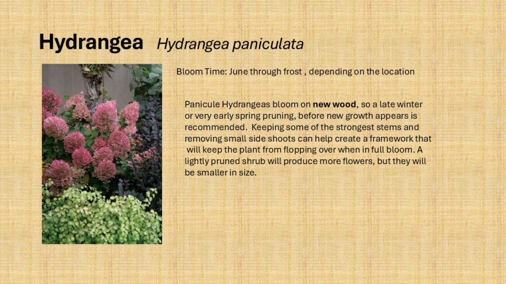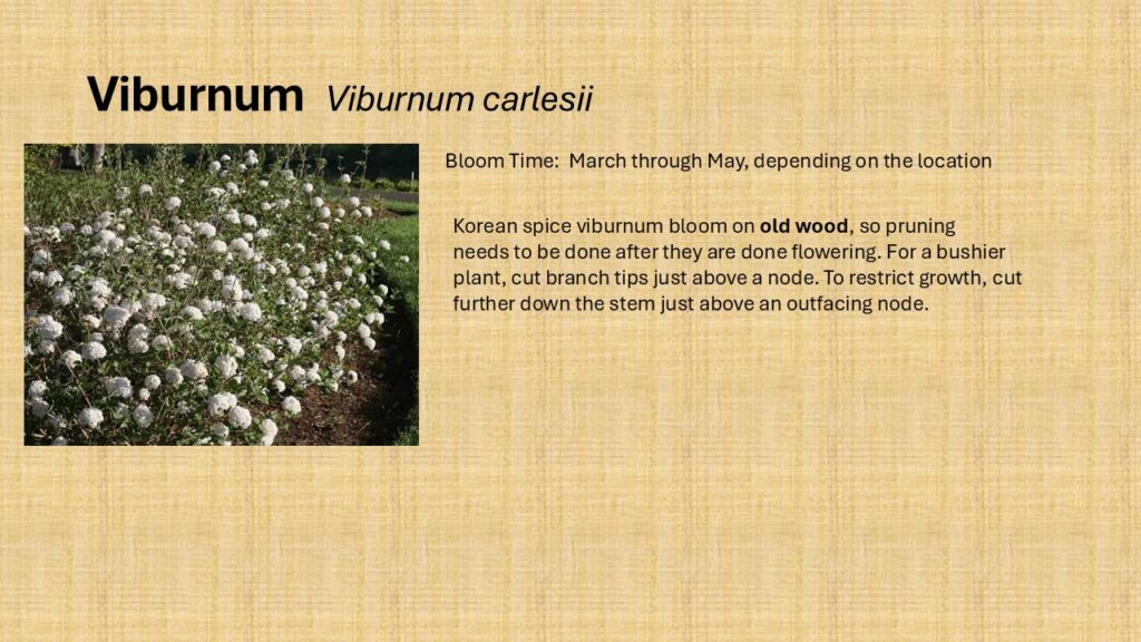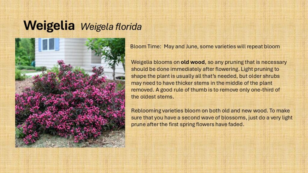 Flowering shrubs either bloom on old wood or new wood.  Old wood is defined as growth that the plant put on the previous year. New wood then is the growth put on during the current growing season. Knowing the plant’s bloom habit is one of the essential elements in proper pruning since pruning at the wrong time can destroy any chance of flowering.