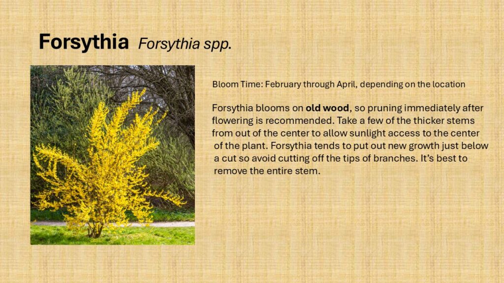 Late fall and early winter is often thought of as the best time to prune shrubs and trees. For many species, fall is a prime pruning time, but for some, like my neighbor’s forsythias, cutting back in fall spells disaster.  Knowing when and how to prune your flowering shrubs will help keep your landscape in full bloom for years to come.